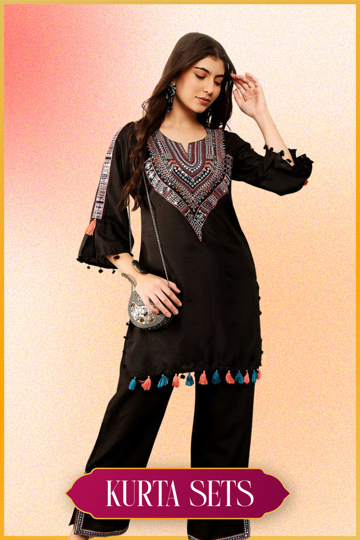 Black Silk Blend Solid Embroidered Coord Sets VCORD1113
