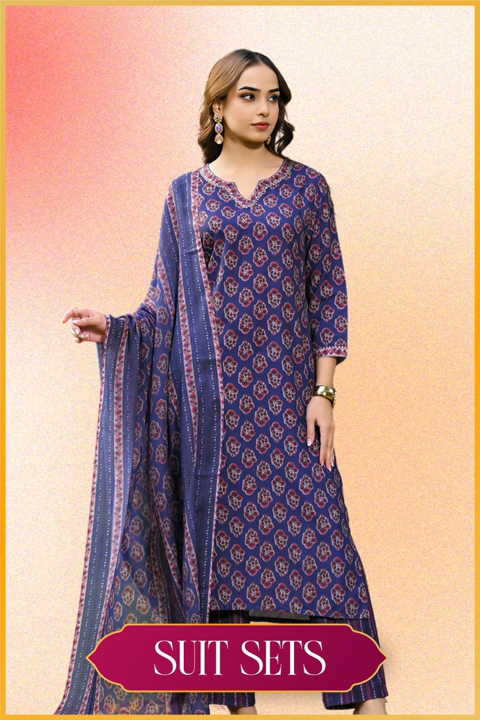 Blue Rayon Blend Floral Printed Straight Kurta Trousers With Dupatta VKSKD2360
