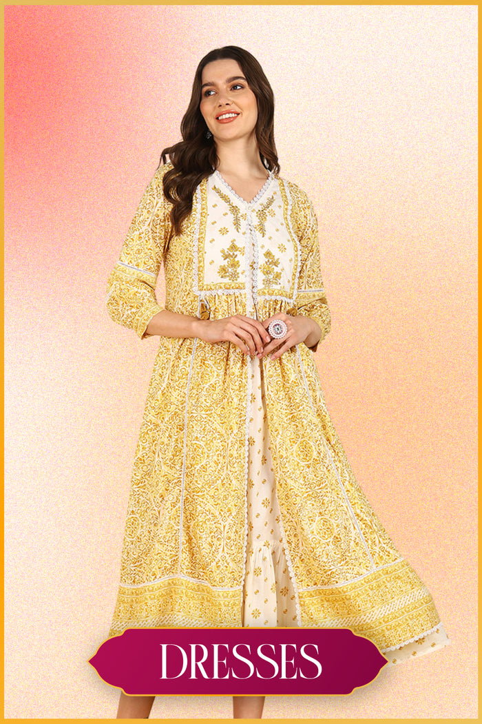 Yellow Cotton Blend Ethnic Motifs Printed Regular Top VT1389