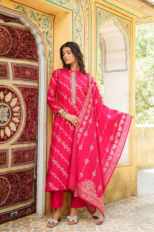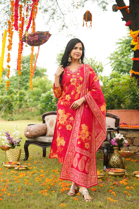 Pink Silk Blend Floral Printed Straight Kurta Trousers With Dupatta SKSKD3044