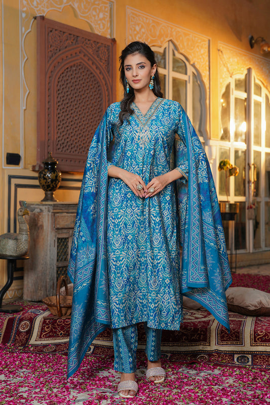 Blue Silk Blend Ikat Printed Straight Kurta Trousers With Dupatta SKSKD3103