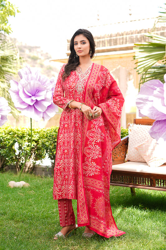 Red Silk Blend Ikat Printed Straight Kurta Trousers With Dupatta SKSKD3104