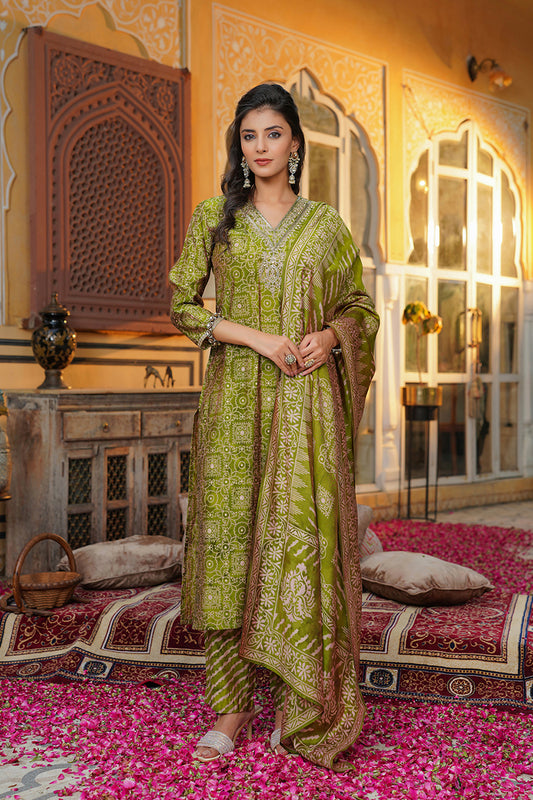 Green Silk Blend Floral Embroidered Straight Kurta Trousers With Dupatta SKSKD3120