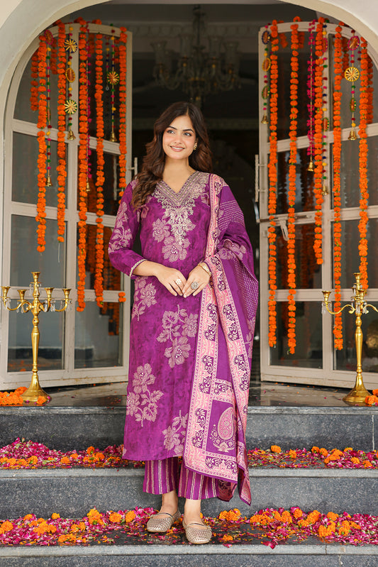 Purple Silk Blend Floral Embroidered Straight Kurta Trousers With Dupatta SKSKD3121