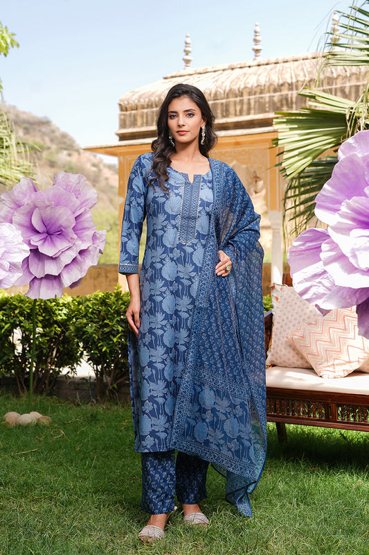 Blue Viscose Rayon Floral Printed Straight Kurta Trousers With Dupatta SKSKD3125