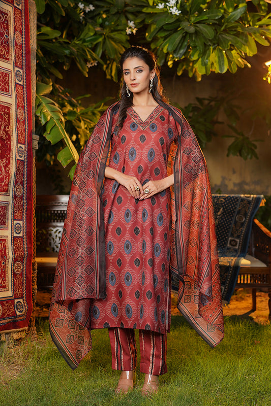 Red Silk Blend Ikat Embroidered Straight Kurta Trousers With Dupatta SKSKD3105