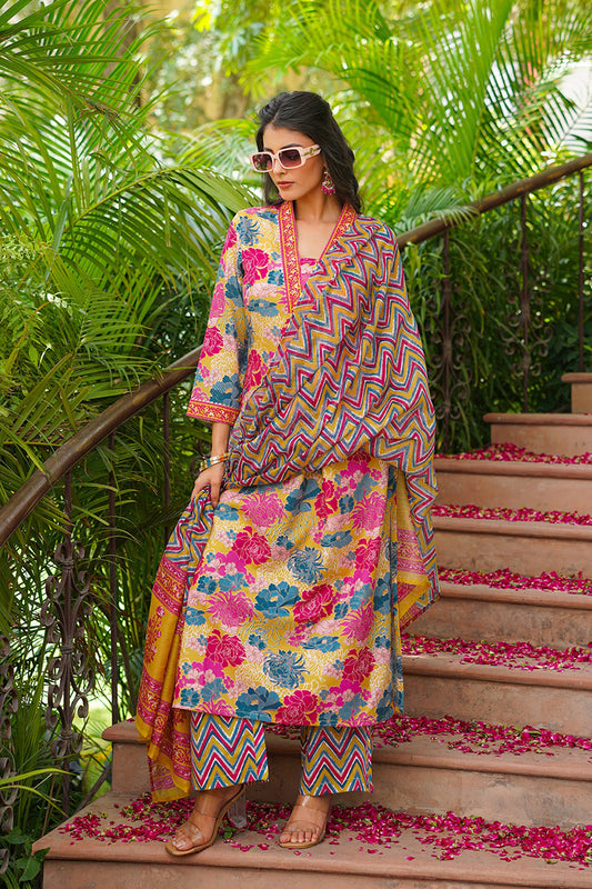 Yellow Rayon Blend Floral Printed Straight Kurta Palazzos With Dupatta VKSKD2366