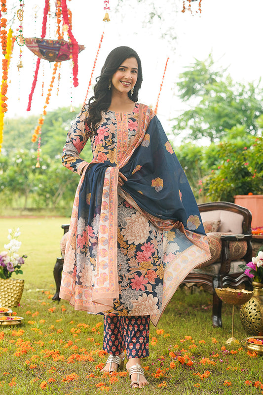 Blue Cotton Blend Floral Printed Straight Kurta Trousers With Dupatta VKSKD2415