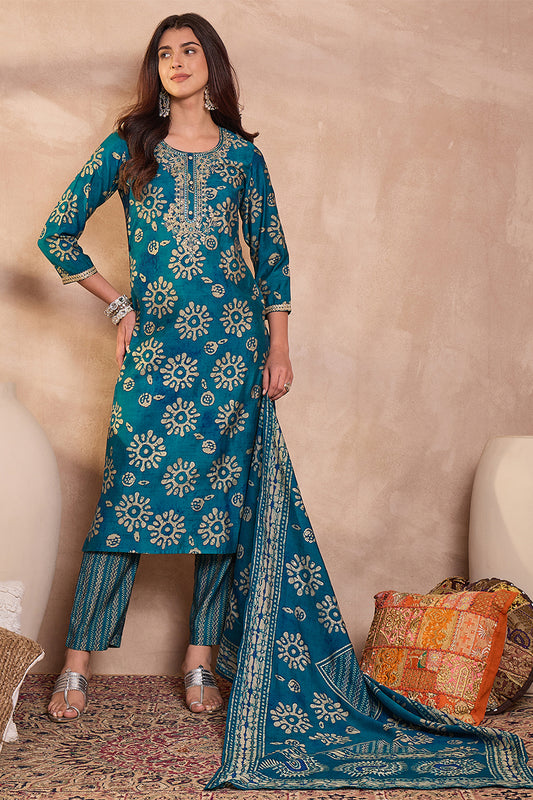 Blue Viscose Ethnic Motifs Printed Straight Kurta Trousers With Dupatta PKSKD3157