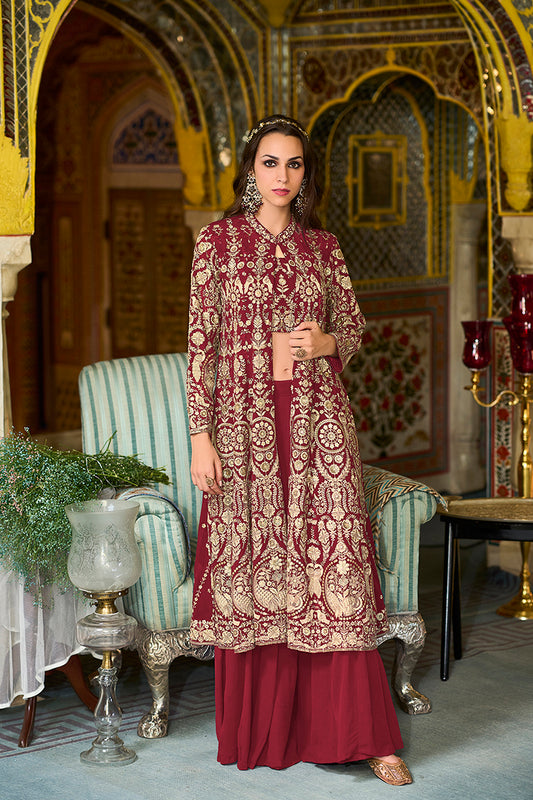 Maroon Georgette Embroidered Straighit Top Sharara With Shrug PKSKD2941
