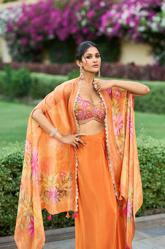 Orange Silk Blend Embroidered Straighit Top Skirt With Shrug PKSKD2952