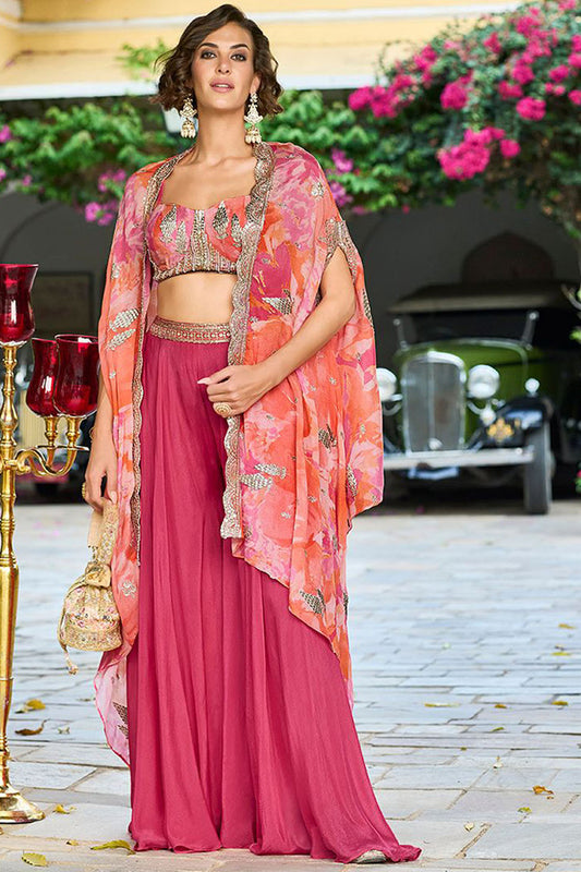Pink Silk Blend Embroidered Straighit Top Skirt With Shrug PKSKD2953
