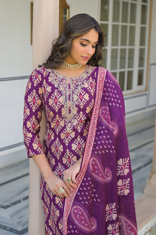 Purple Silk Blend Bandhani Embroidered Straight Kurta Trousers With Dupatta PKSKD3108