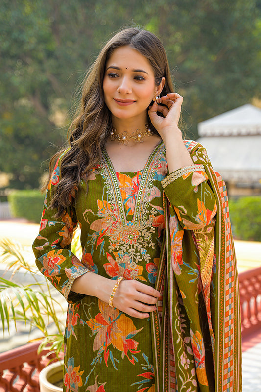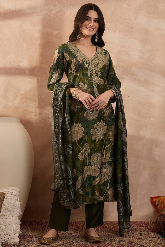 Green Viscose Floral Embroidered Straight Kurta Trousers With Dupatta PKSKD3139
