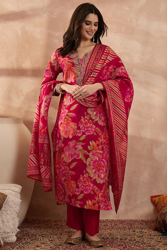 Pink Cotton Blend Floral Printed Straight Kurta Trousers With Dupatta VKSKD2405