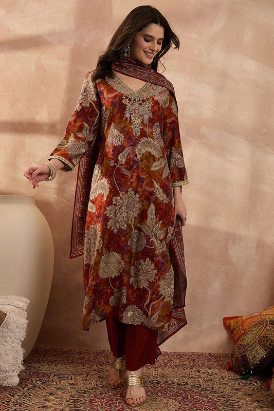 Brown Cotton Blend Floral Printed Straight Kurta Trousers With Dupatta VKSKD2413