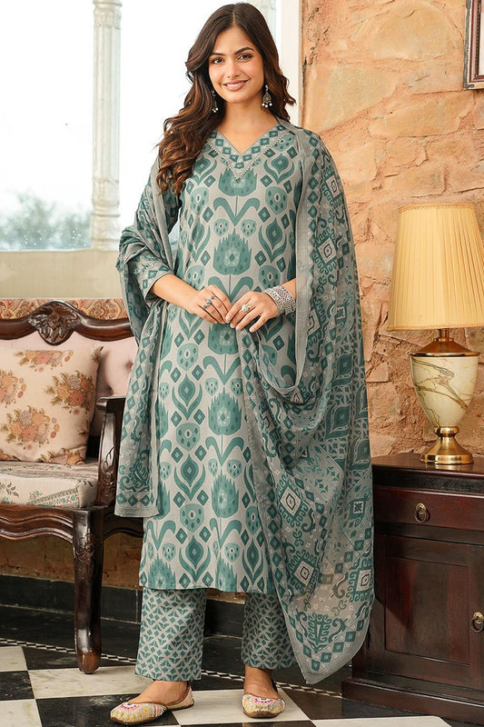 Grey Cotton Blend Ethnic Motifs Printed Straight Kurta Trousers With Dupatta VKSKD2403