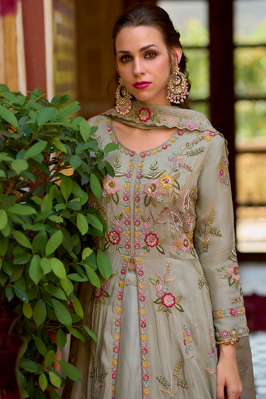 Grey Silk Blend Embroidered Anarkali Kurta Skirt with Dupatta PKSKD2866