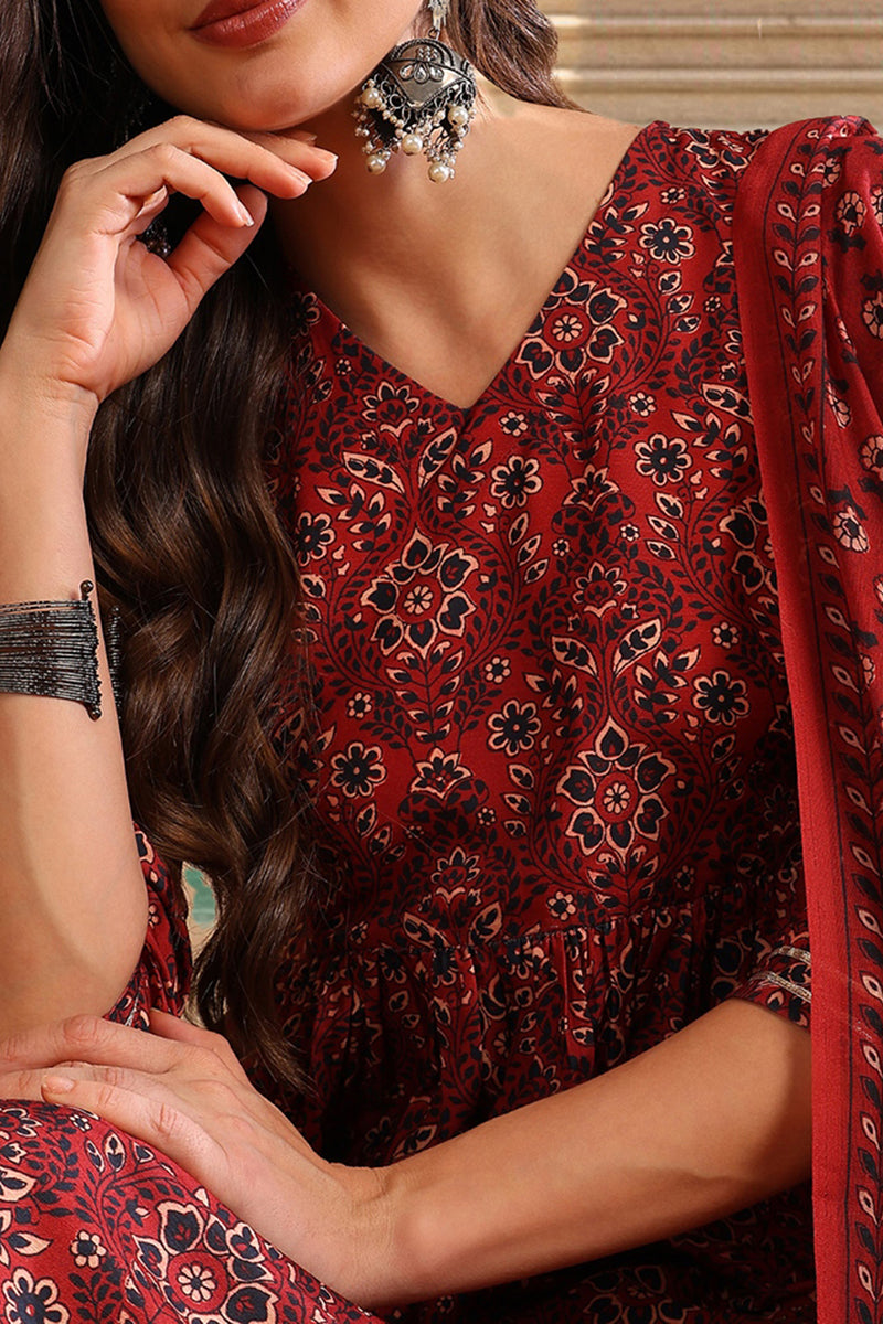Red Rayon Blend Floral Printed A-Line Trouser Bottom Suit Set VKSKD2273