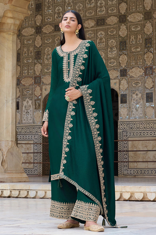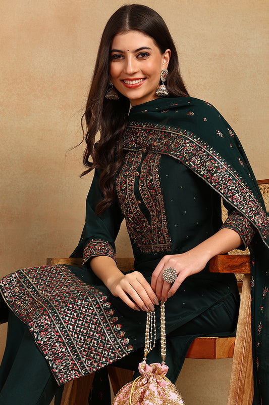 Green Silk Blend Solid Embroidered Straight Suit Set PKSKD2261