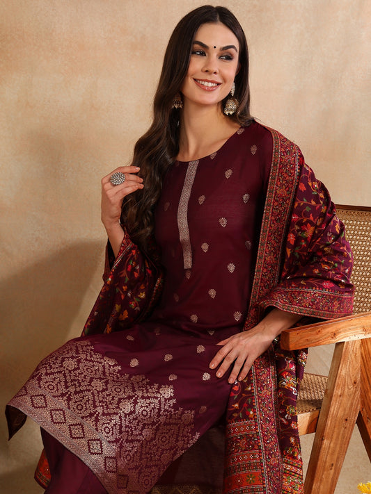 Burgundy Poly Chanderi Woven Design Straight Suit Set PKSKD2306