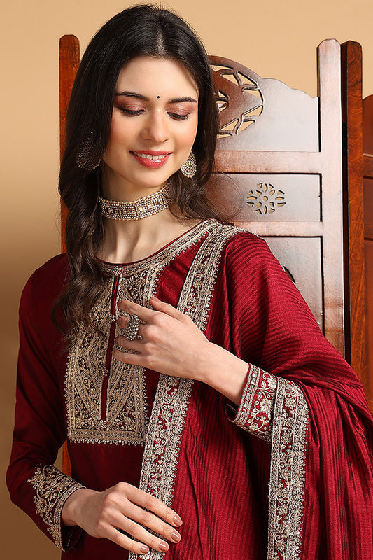Maroon Silk Blend Solid Embroidered Straight Suit Set PKSKD2260