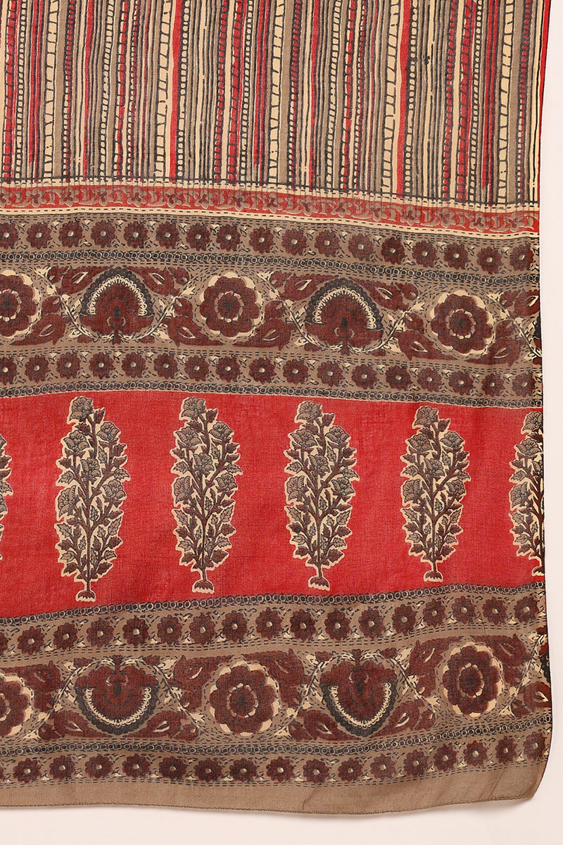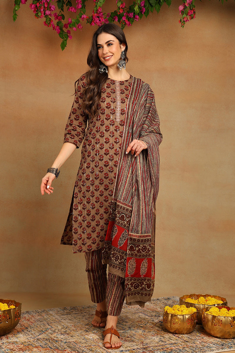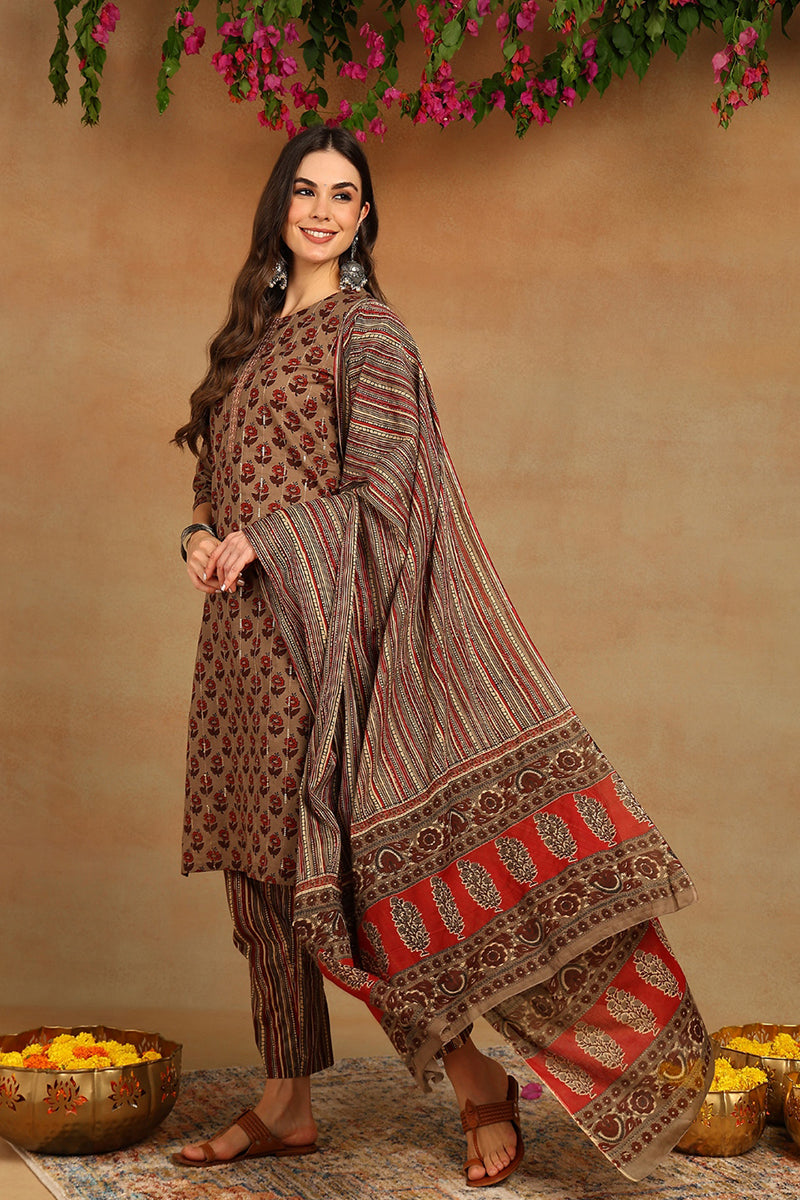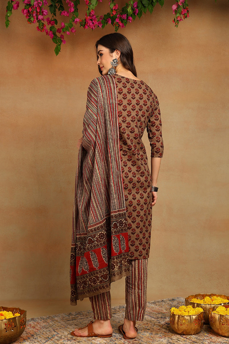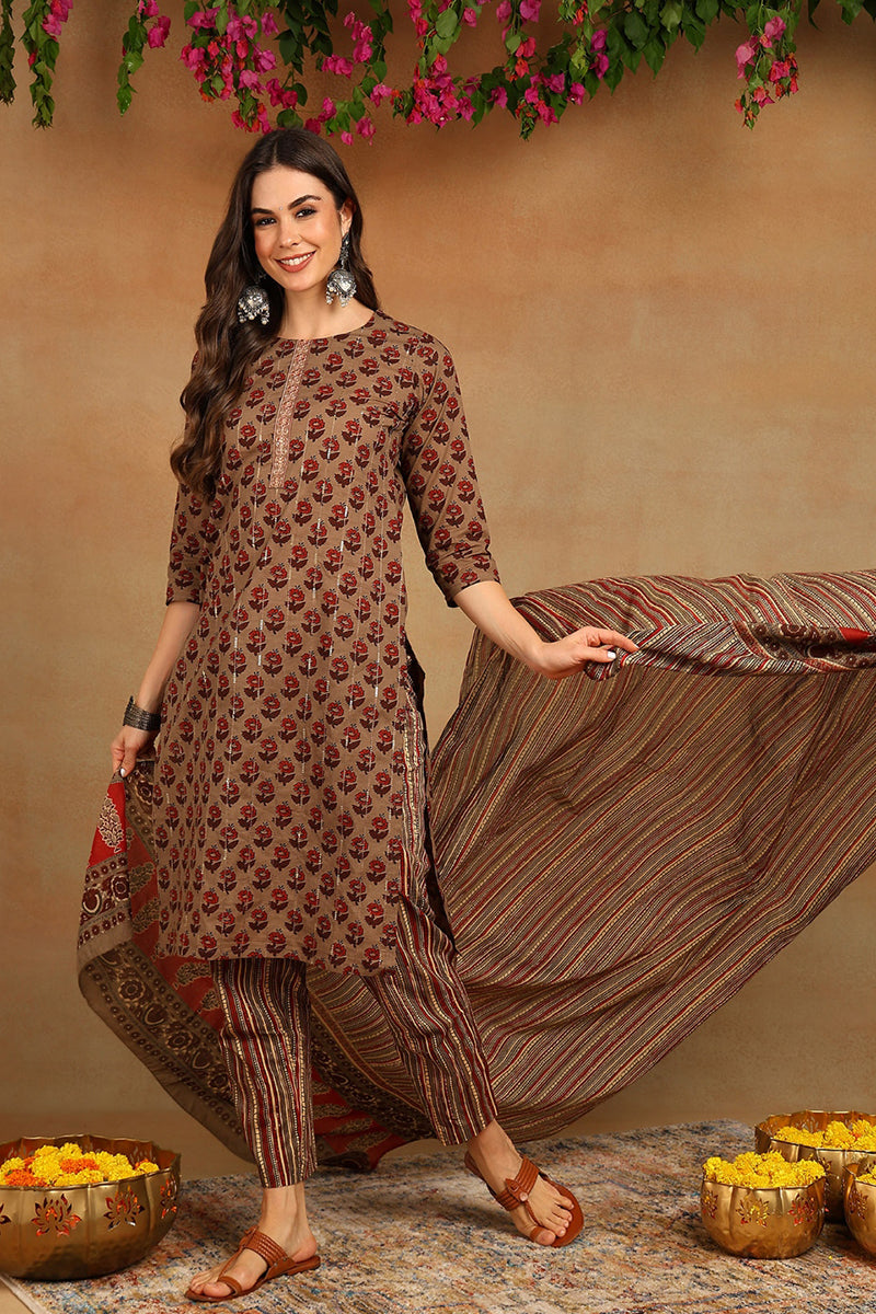Cotton Beige Printed Straight Kurta Pant With Dupatta VKSKD1850