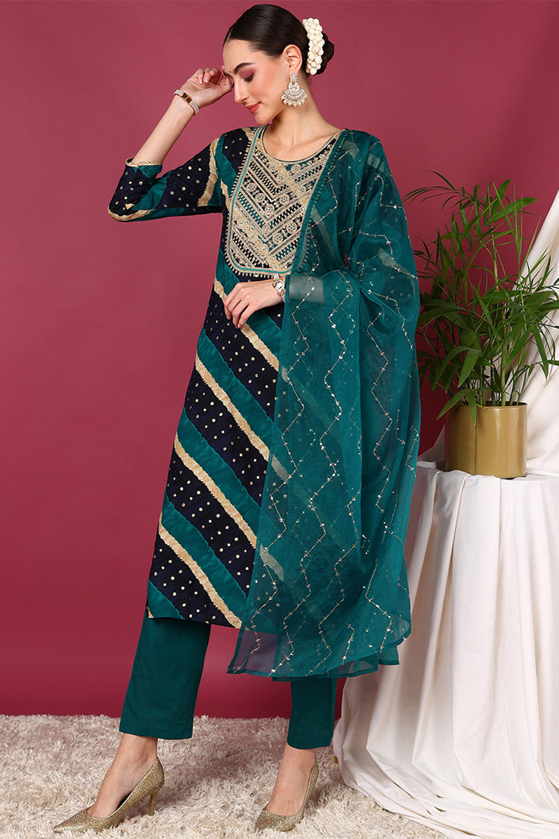 Plus Size Navy Blue Viscose Rayon Leheriya Printed Yoke Design Straight Suit Set VKSKD2099