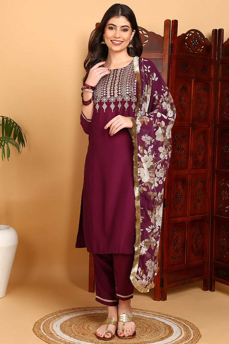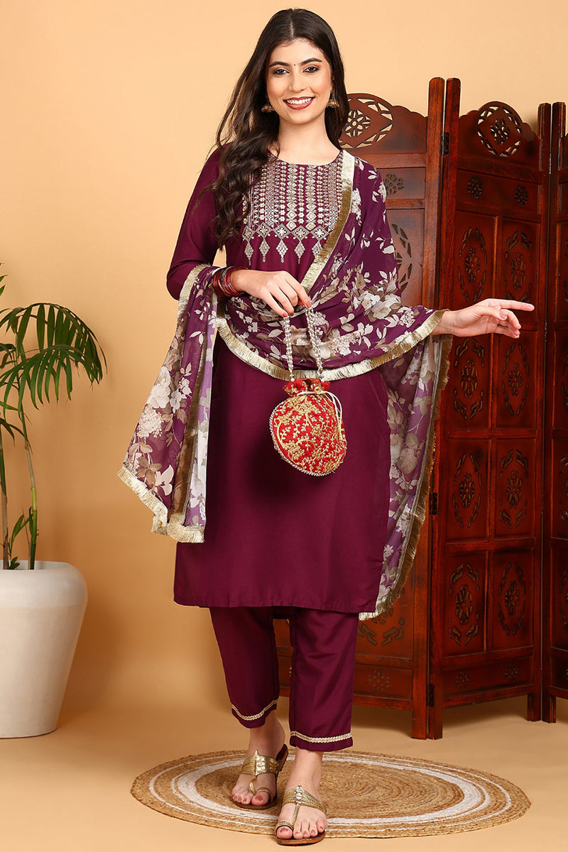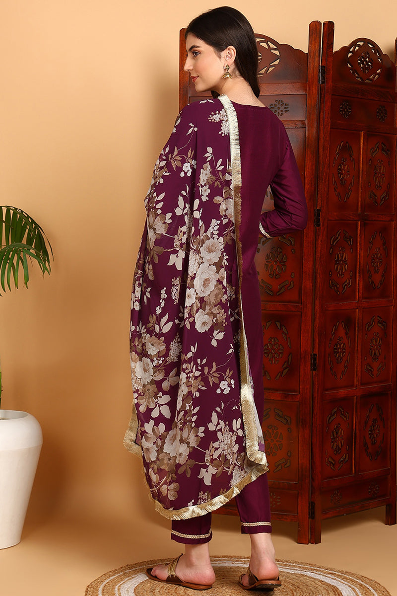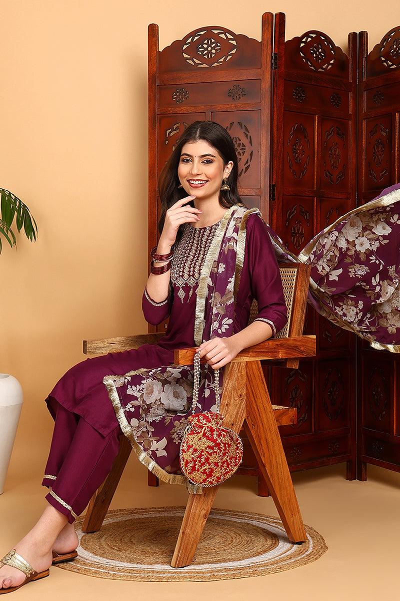 Purple Silk Blend Yoke Design Kurta Pant With Dupatta PKSKD1870