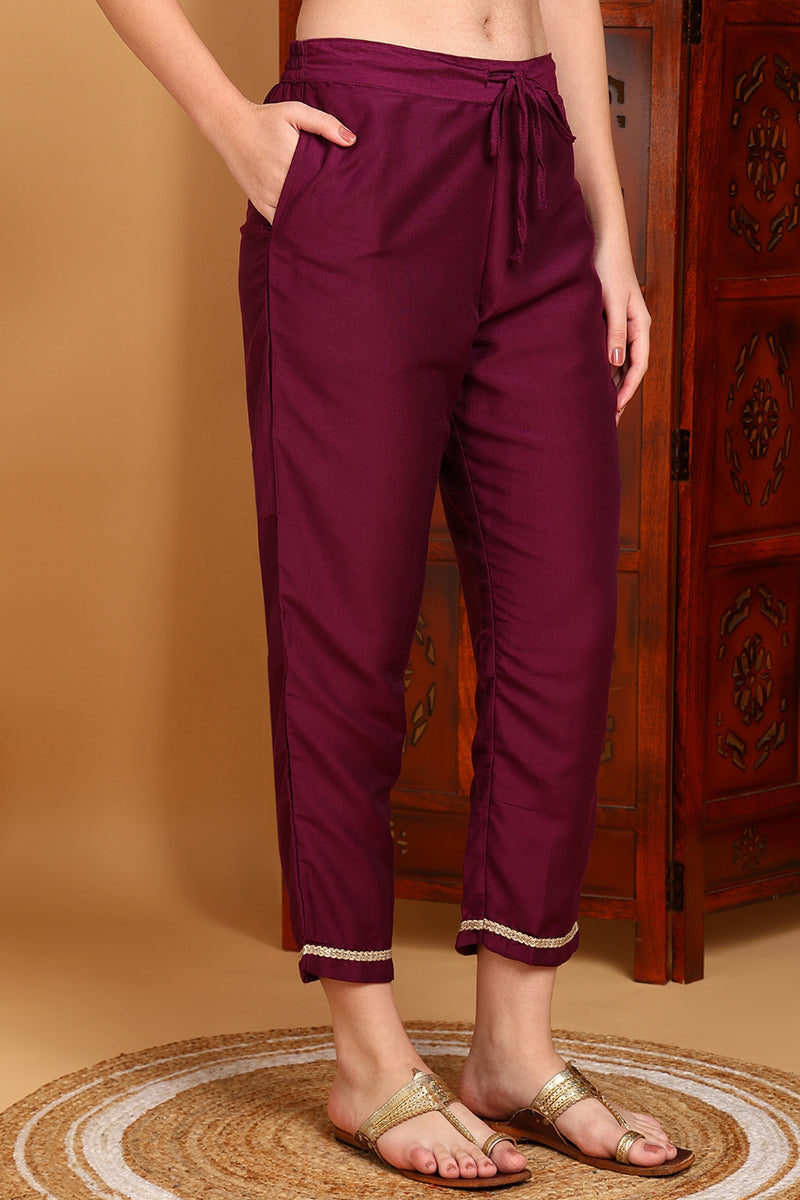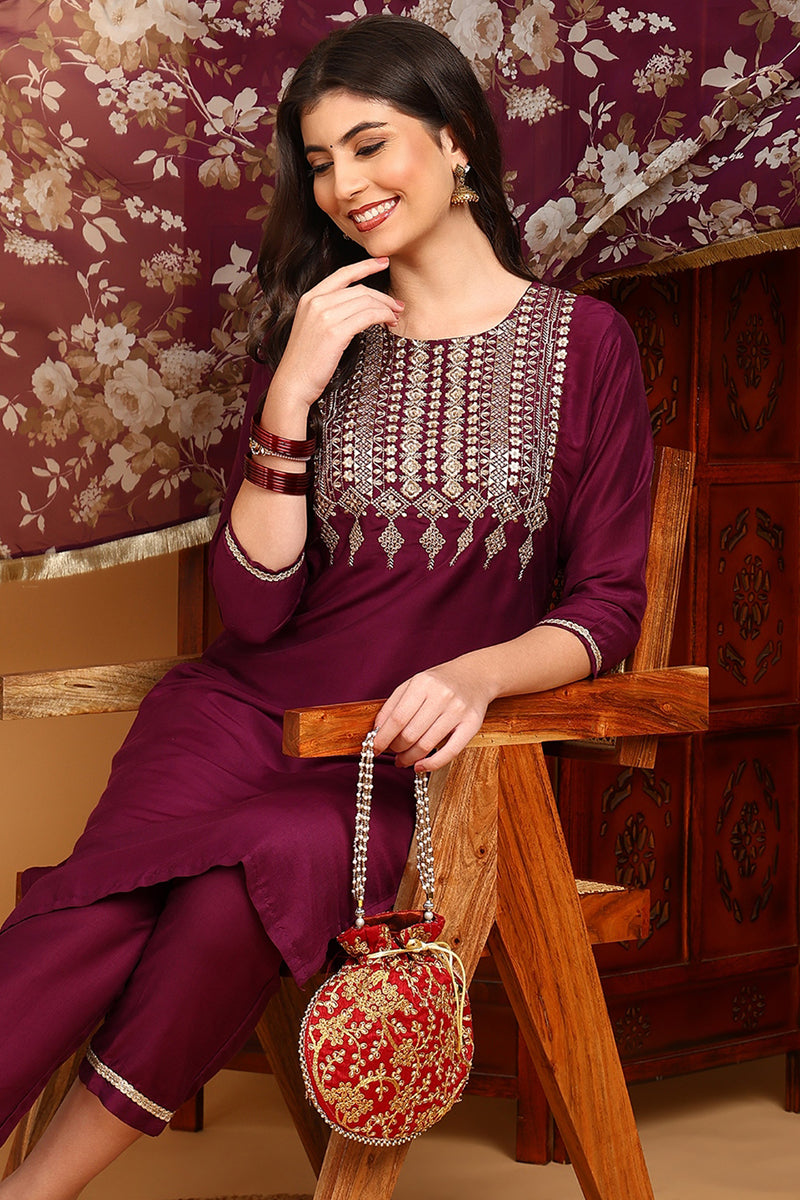 Brighten up your wardrobe with this Purple, gold yoke-Color Silk Blend embroidered Straight Trouser Suit Set. Designed with a soft and breathable Silk Blend, this vibrant ensemble features a straight-cut kurta adorned with beautiful embroidered , paired with comfortable trousers and a matching dupatta. Perfect for casual outings, festive celebrations, or summer gatherings, this set offers a stylish yet effortless look.