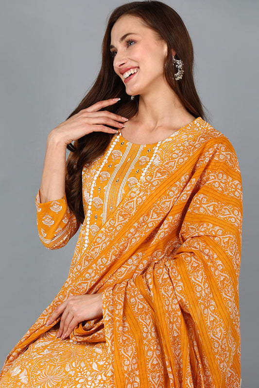 Mustard Pure Cotton Printed Kurta Trousers With Dupatta VKSKD1491