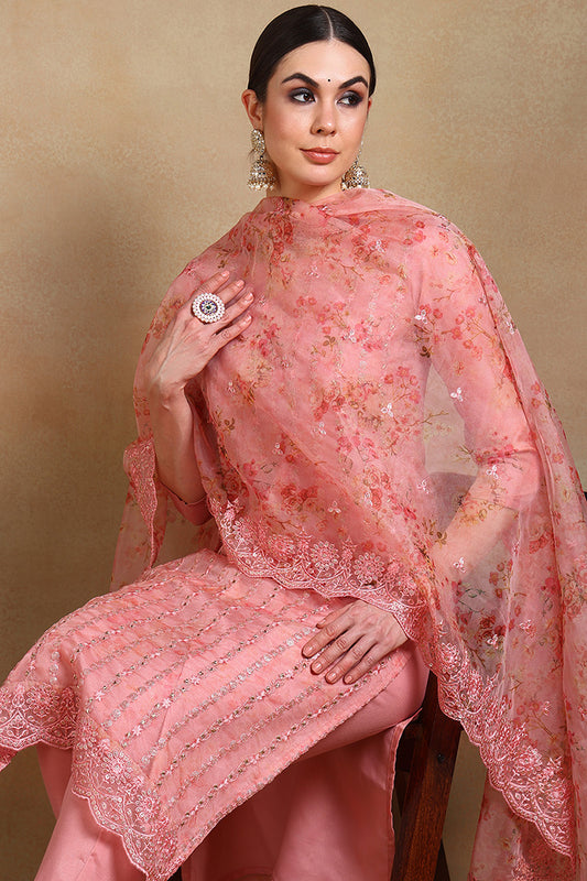 Peach Organza Ethnic Motifs Straight Suit Set PKSKD1795