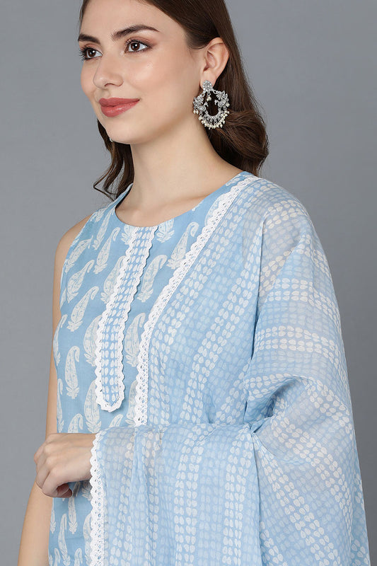 Cotton Blue Bandhani Printed Straight Kurta Pant With Dupatta VKSKD1925