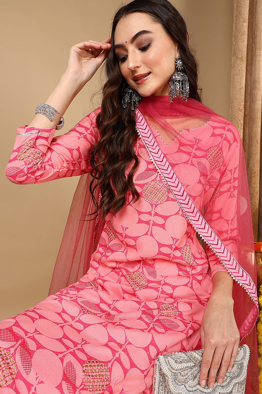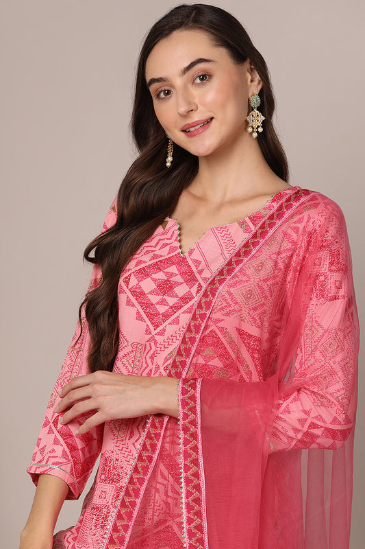 Plus Size Pink Viscose Rayon Geometric Printed Straight Suit Set VKSKD1990