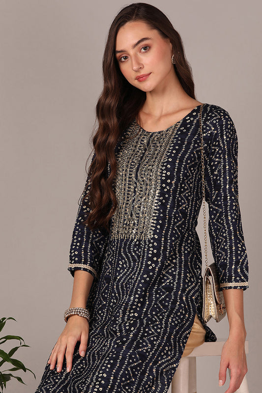 Plus Size Navy Blue Viscose Rayon Bandhani Embroidered Straight Kurta VCK9625