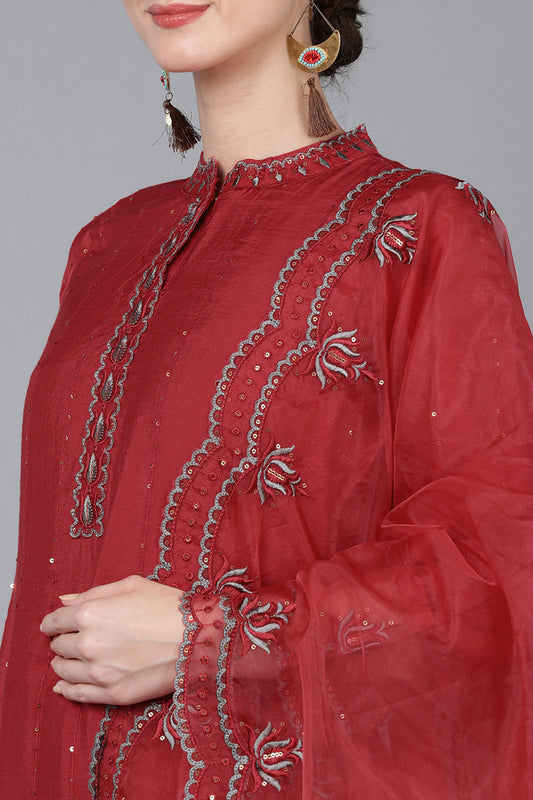Red Poly Silk Sequin Embroidery Straight Suit Set PKSKD1387