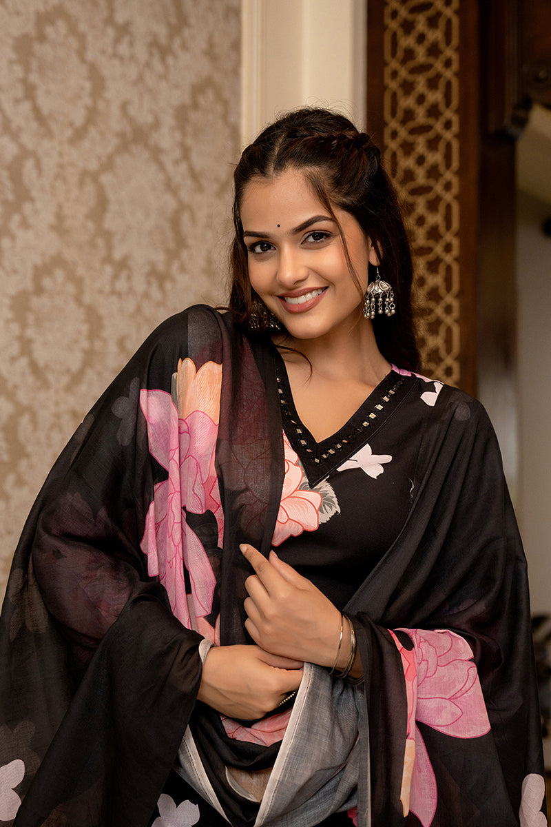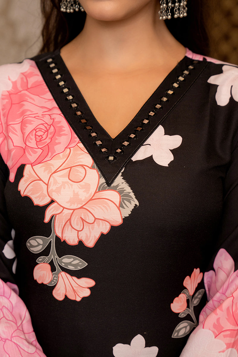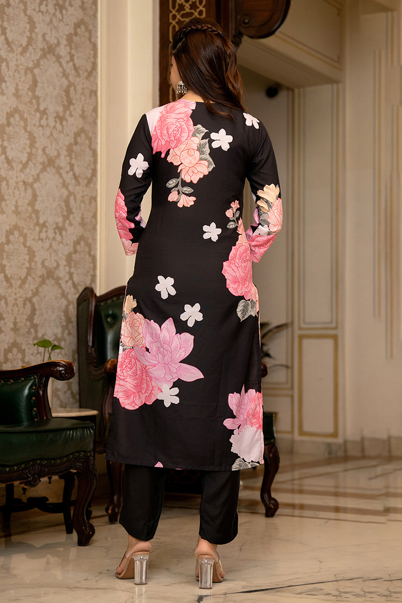 Black Rayon Blend Floral Printed Straight Trouser Suit Set PKSKD2514BLK