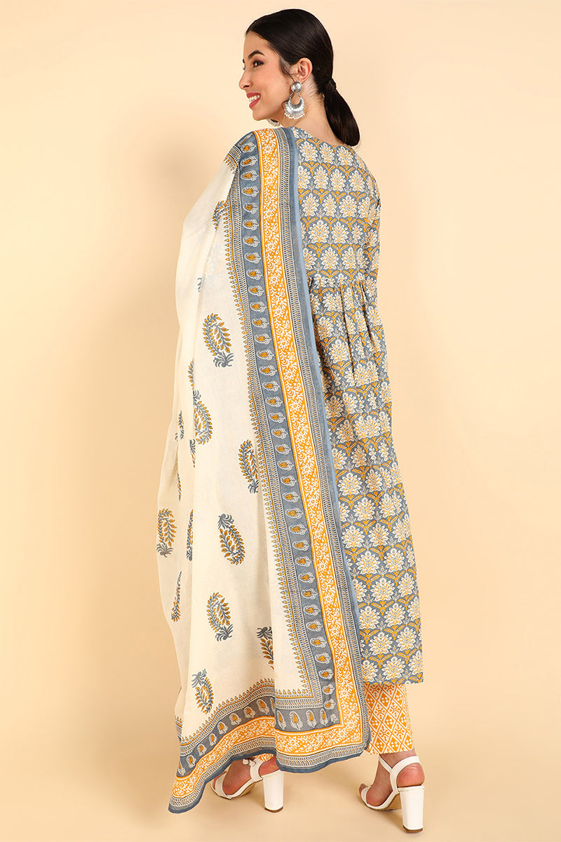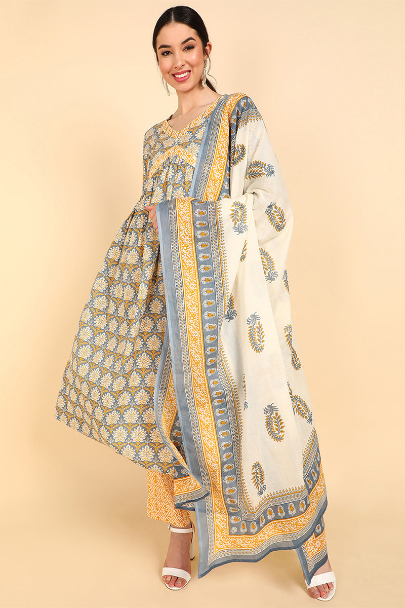 Yellow Pure Cotton Ethnic Motifs Printed Flared Style Suit Set VKSKD1386