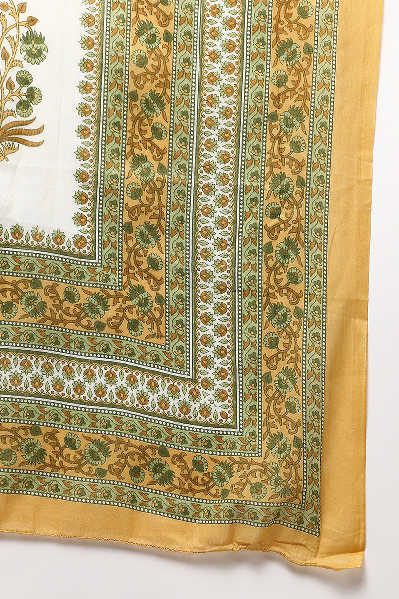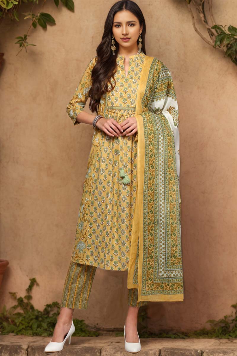 Feel the warmth of the sun and the breeze on your skin in this beautiful yellow pure cotton printed flared suit set. The kurta is a relaxed fit with a round neck and three-quarter sleeves, and it features a beautiful floral print. The dupatta is made of the same fabric as the kurta and it can be worn in a variety of ways. This suit set is perfect for a casual day out or a special occasion. It is sure to turn heads and make you feel confident and beautiful.