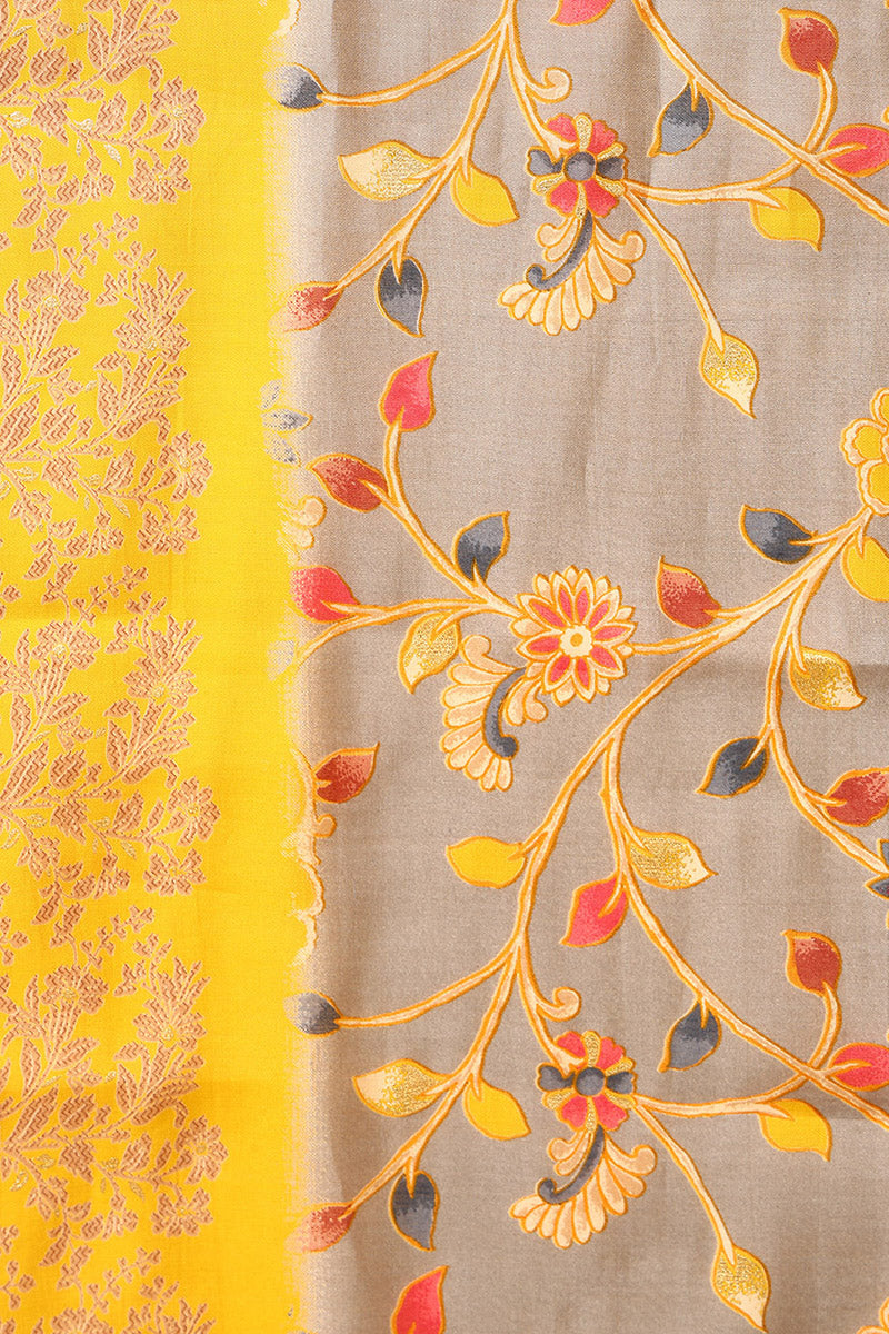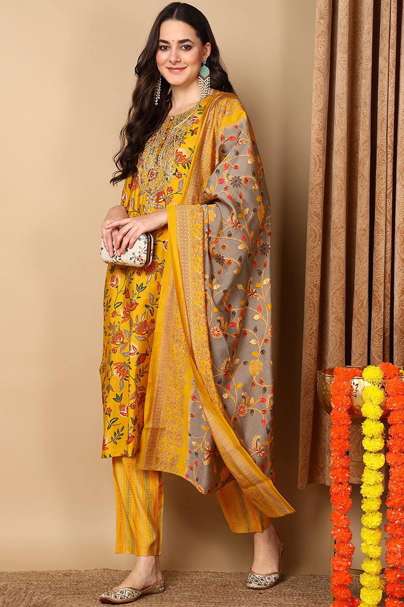Yellow Silk Blend Floral Printed Straight Style Suit Set PKSKD2034