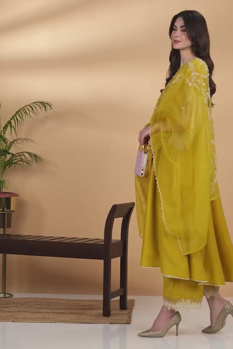 Yellow Silk Blend Solid Embroidered Flared Suit Set PKSKD2118