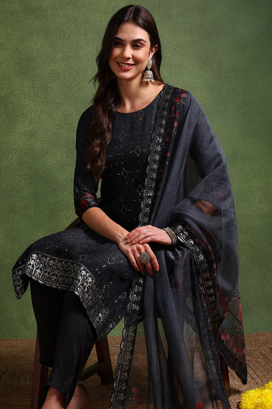 Black Poly Chanderi Ethnic Motifs Straight Suit Set PKSKD1224