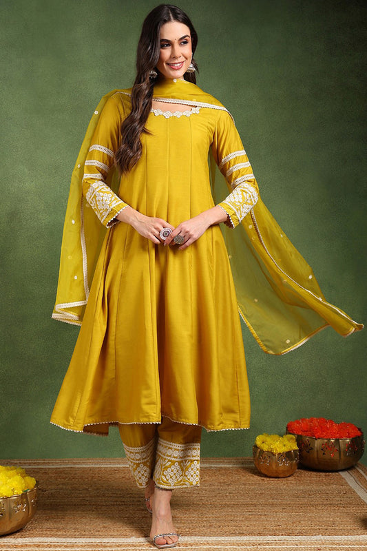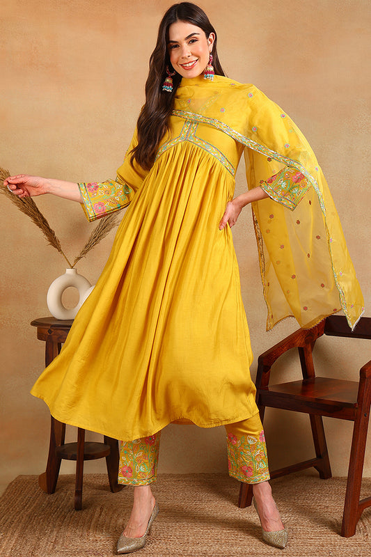 Yellow Silk Blend Solid Yoke Design Flared Style Suit Set PKSKD2125