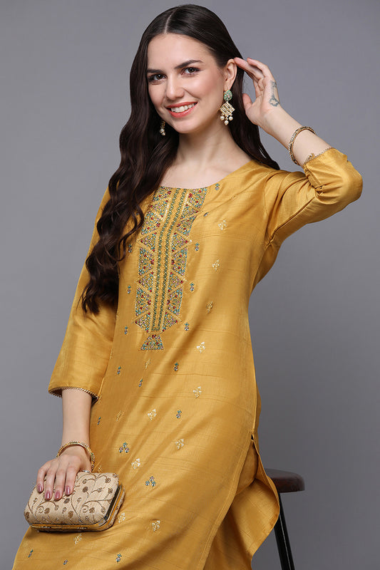 Yellow Silk Blend Solid Embroidered Straight Suit Set VKSKD1984