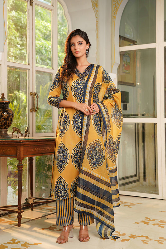 Yellow Rayon Blend Ethnic Motifs Printed Straight Kurta Trousers With Dupatta VKSKD2368