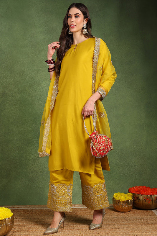 Yellow Silk Blend Straight Kurta Palazzo With Dupatta PKSKD1856
