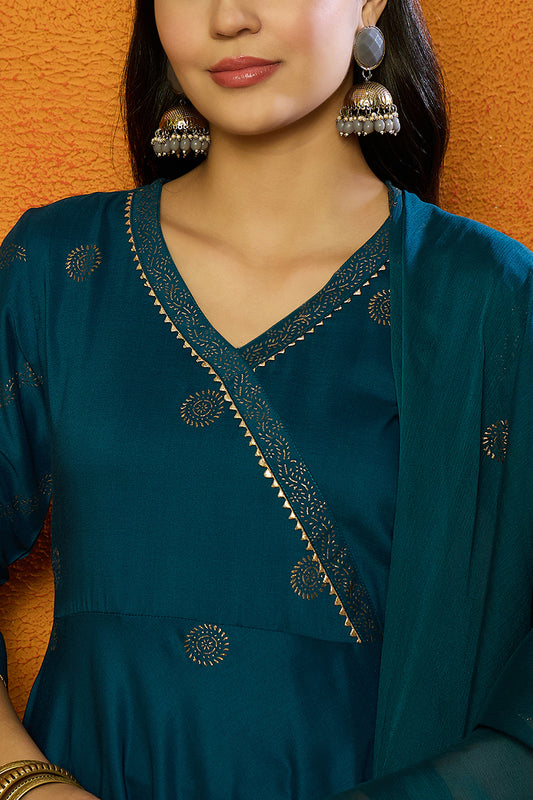 Teal Blue Silk Blend Solid Embroidered Anarkali Suit Set PKSKD2735