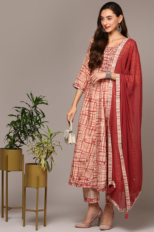 Red Silk Blend Abstract Printed Flared Suit Set VKSKD1959