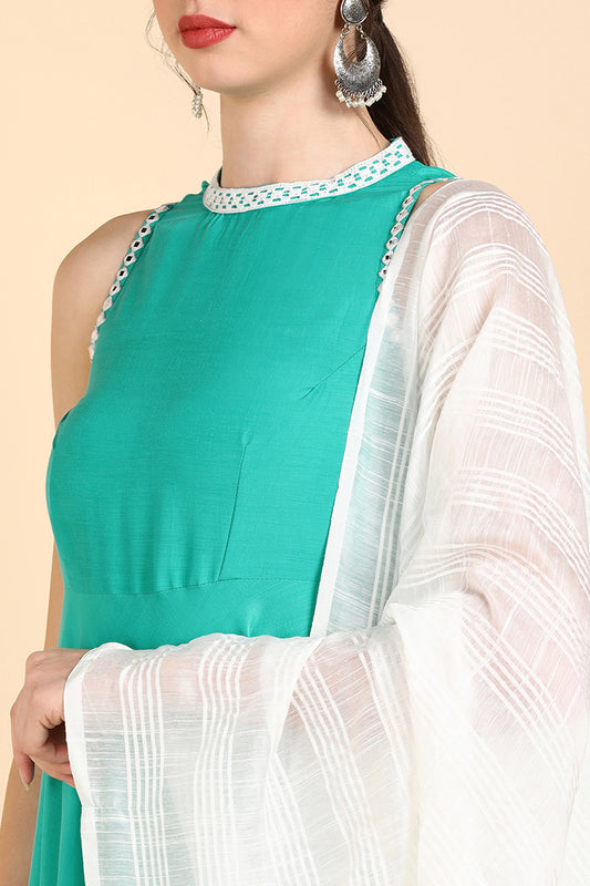 Teal Silk Blend Anarkali Woven Design Kurta Pant With Dupatta PKSKD1919
