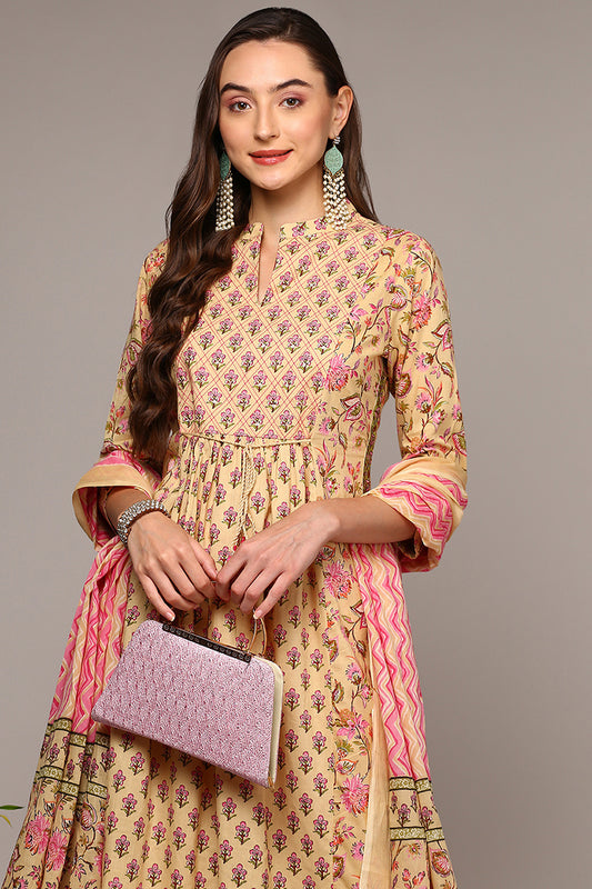 Cream Pure Cotton Printed Flared Suit Set VKSKD1966